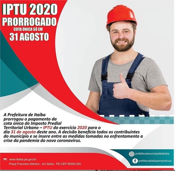 Já está em vigor o Decreto Municipal que prorrogou o pagamento da cota única do Imposto Predial Territorial Urbano – IPTU do exercício 2020 para o dia 31 de agosto deste ano. A decisão beneficia todos os contribuintes do município e se insere entre as medidas tomadas no enfrentamento a crise da pandemia do novo coronavírus que vem sendo tomadas pela Prefeitura de Itaíba desde meados de março. A prorrogação se fez urgente diante da crise financeira que afeta todos os moradores de Itaíba decorrentes das restrições das atividades econômicas devido ao isolamento social para fins de proteção à vida, em razão do Covid-19. Vamos todos fazer a nossa parte, se puder fique em casa e se precisar sair, use a máscara de proteção.